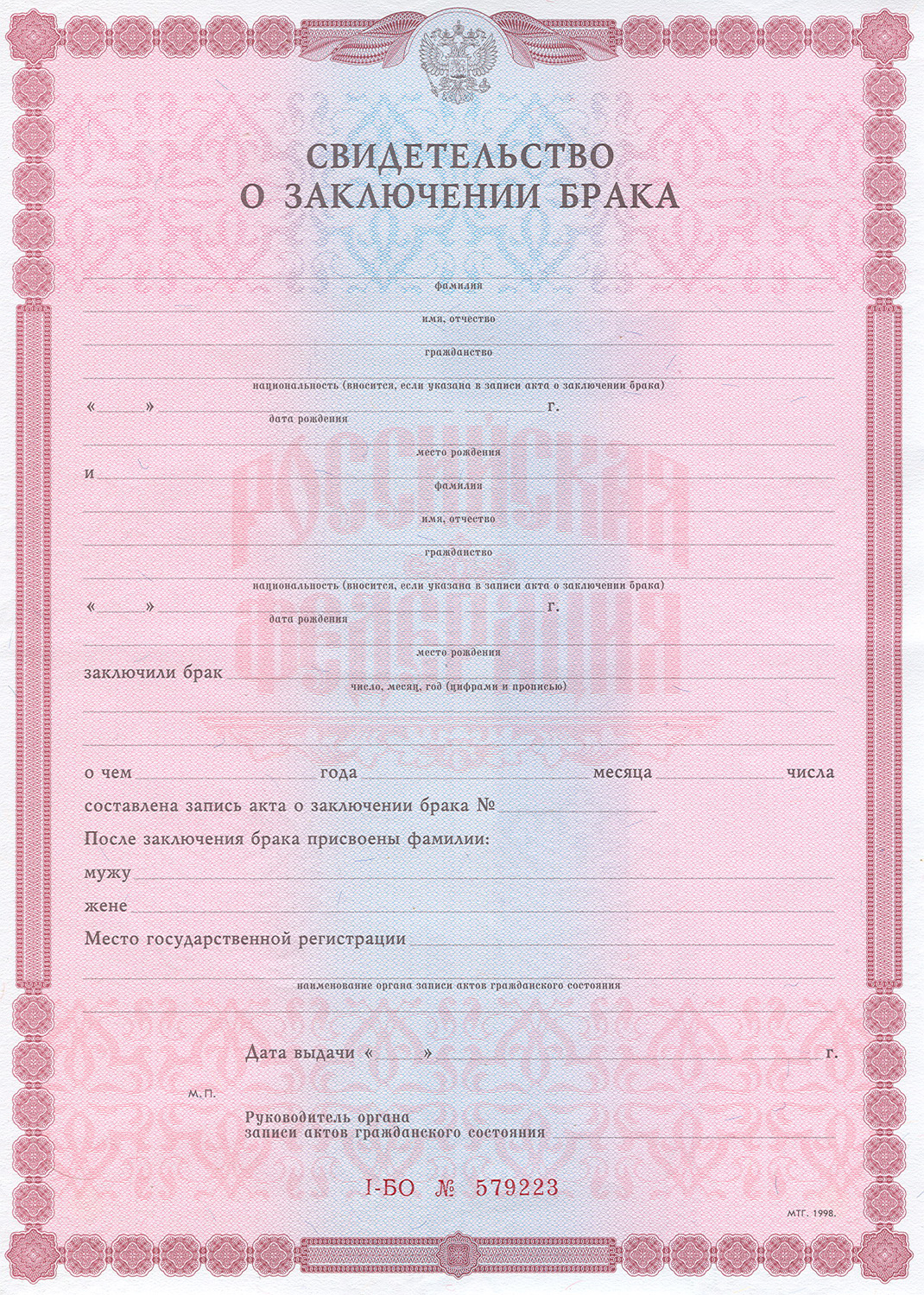 Свидетельство о браке – это документ, изготовленный на официальном бланке. Он содержит гербовые печати и водяные знаки для гарантии подлинности. Если на документе есть какие-либо исправления вручную, он считается недействительным. В таком случае супругам придется оформлять документ заново.