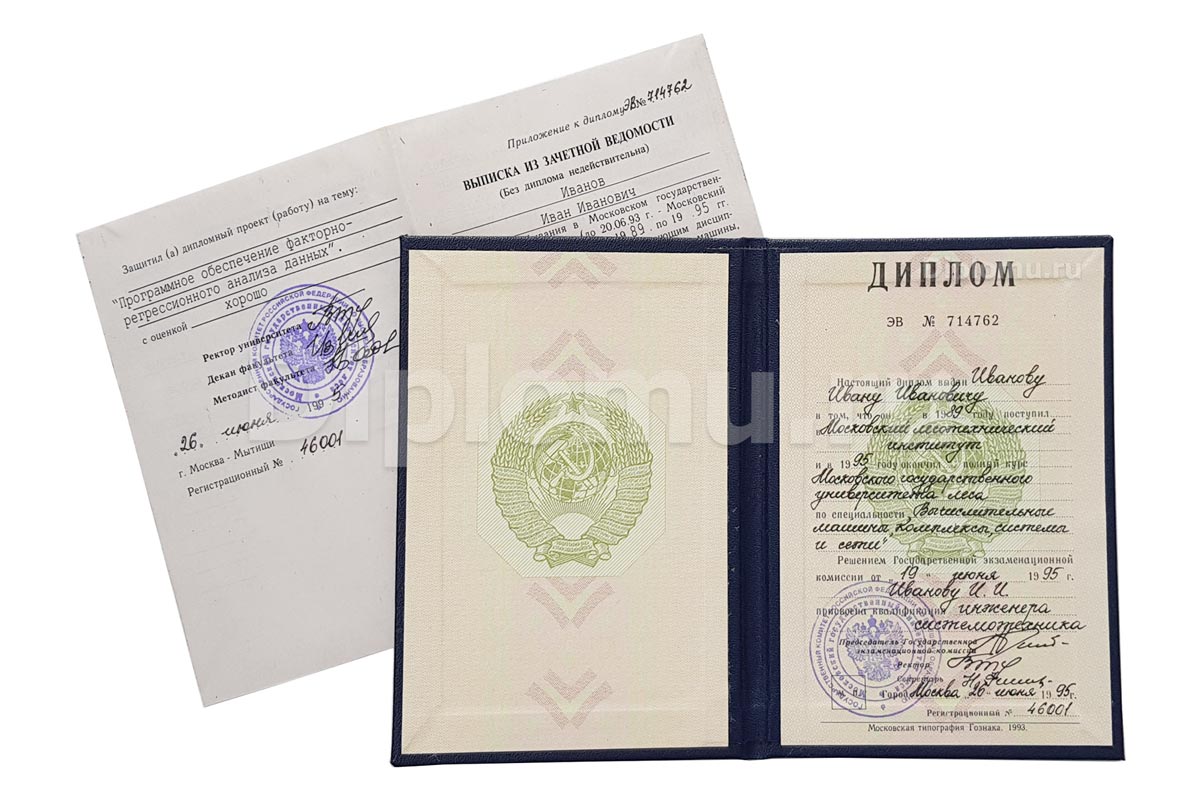 На нашем сайте Вы можете купить диплом ВУЗа СССР о высшем образовании с окончанием института или университета в период с 70-x годов и до 1996 года включительно. До 1991-1993 годов старые дипломы заверялись гербовой печатью СССР (РСФСР), а позднее — печатью РФ с двуглавым орлом. Наши специалисты заполнят диплом по всем правилам, установленным на тот период. Заверяются «мокрыми» печатями и нужными подписями.